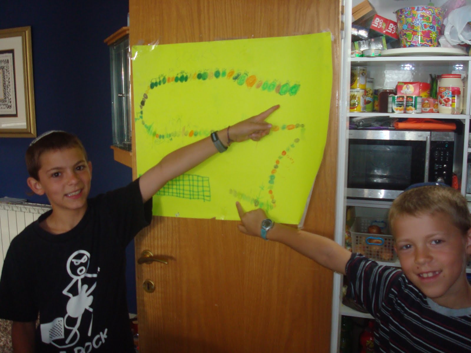 So, Matan meticulously sat down and created a caterpillar with 100 little compartments. The goal was for the four of us (Josh, me, Matan and Yehuda) to read 100 books over the course of the school year. We set our sights to June 30 as our goal. We created a color coding for ourselves so that I would color in a purple circle when I finished a book, Josh would color in an orange circle, etc.