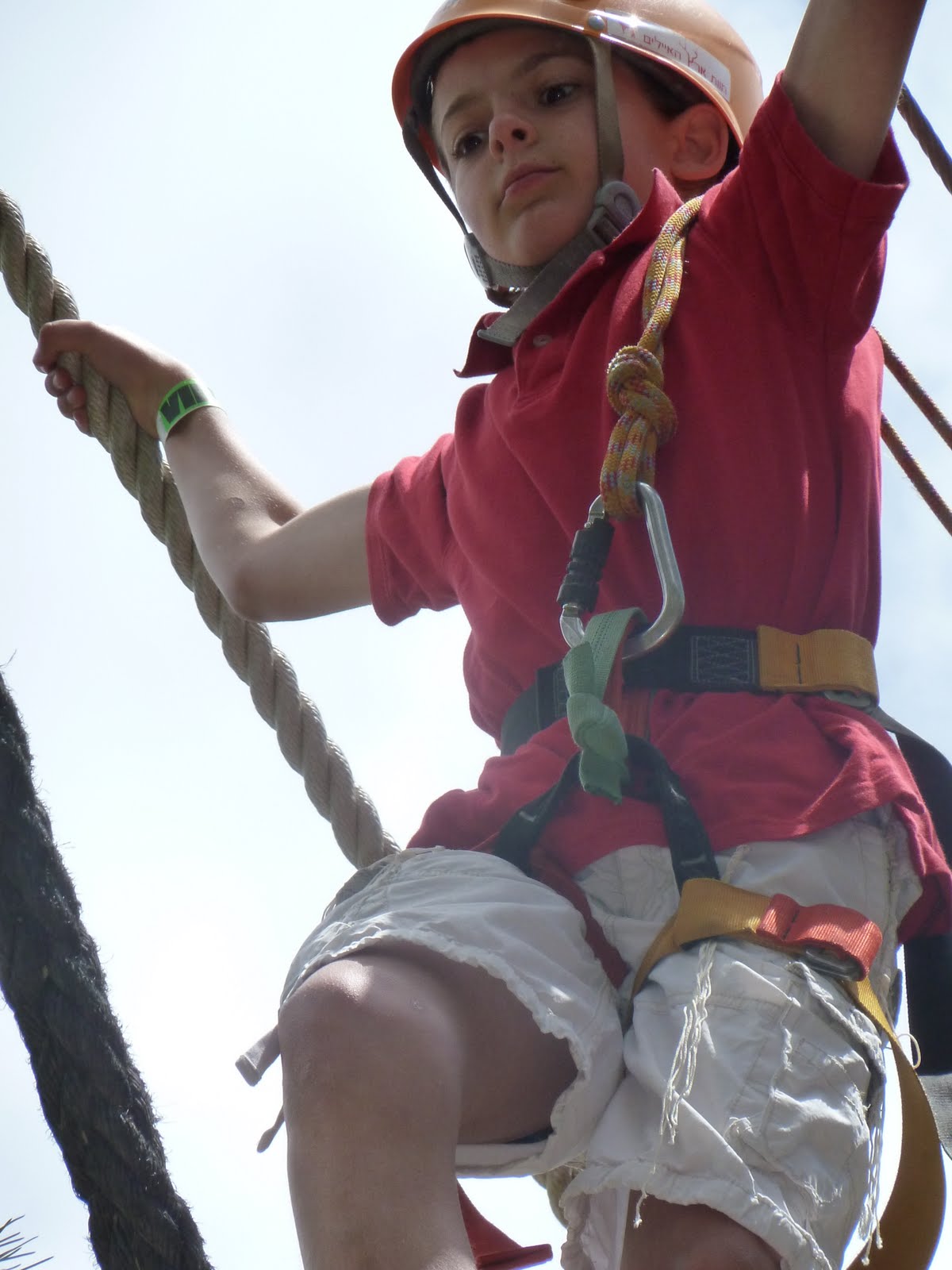 Next, it was Matan’s turn. It turned out that Matan was probably barely at the minimum height to be able to accomplish the course. When he got to the steps section he simply wasn’t tall enough to get from one hanging step to the next. I was immensely proud, however, of how he handled himself. While he was clearly quite scared and had a catch in his voice as he asked us for help, he continued to try to get to the next step. Finally, after quite awhile, the person running the course came up into the trees and swung the step towards him. Catching it with great relief, Matan thanked him and started on his way. The crowd that had formed below let out a surprising cheer and Matan finished the course with no more problems.