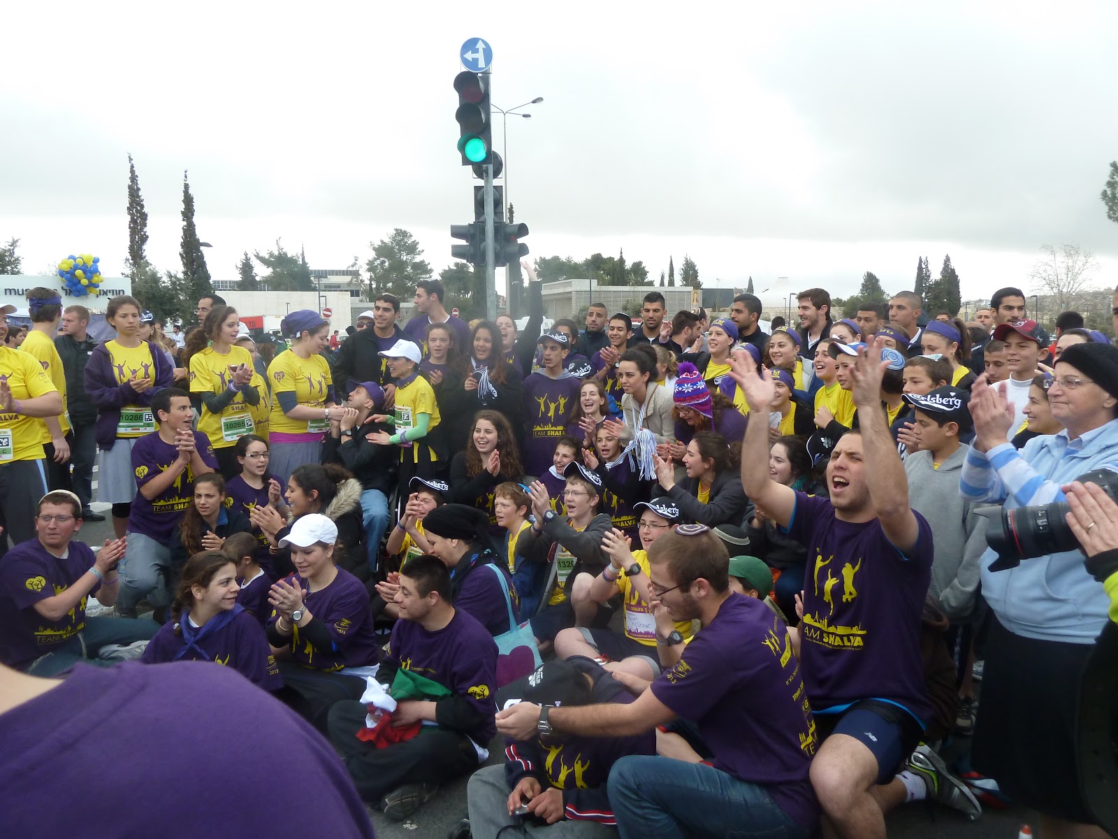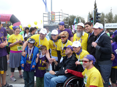 I actually had no idea what was going on, since I hadn’t paid attention to anything other than the directives to find my way to Jerusalem and to be ready for Matan’s 10k run. It soon became apparent to me that Shalva, and a number of other groups, were about to participate in an 800 meter run with the disabled kids. Fighting back tears, I posed with the Shalva group for pictures and then Yehuda and I ran alongside the kids and enjoyed the 800 meter run. It brought me to tears to watch the Shalva counselors encouraging the kids who were running and enjoying their moment in the sun. There was also a cancer group running alongside us (sorry, I didn’t get their name) and there were many kids in wheelchairs.